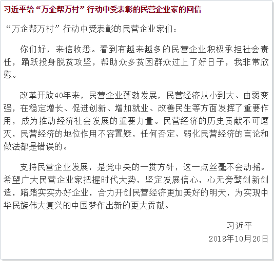 今年10月,全国工商联、国务院扶贫办等单位开展了“万企帮万村”行动先进民营企业表彰活动,表彰了100家民营企业。近日,受到表彰的民营企业家给习近平总书记写信,汇报了参与“万企帮万村”行动的体会,表达了继续为脱贫攻坚贡献力量的决心。10月20日,习总书记给“万企帮万村”行动中受表彰的民营企业家回信,对民营企业踊跃投身脱贫攻坚予以肯定,勉励广大民营企业家坚定发展信心,踏踏实实办好企业。