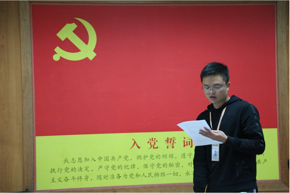 预备党员杨峰向大会汇报个人在预备期间的个人表现、个人情况等