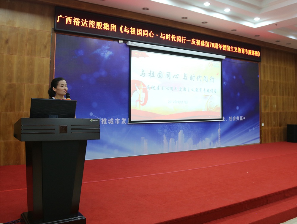 2019年是新中国成立70周年,也是集团公司成立15周年,在祖国70岁诞辰即将到来之际,为加强集团员工爱国爱党精神文明建设,加强集团党员思想政治建设,充分发挥党建引领作用,2019年9月17日晚7点集团党支部、来宾市兴宾区城北街道党工委联合邀请来宾市党校罗克良副教授到集团公司开展“与祖国同心.与时代同行”庆祝建国70周年爱国主义教育专题讲座,集团副总裁乔景坤、集团行政总监黄玲艳、集团党支部书记谢家伟及支部党员、预备党员、集团总部各中心、各公司主管级及以上人员200多人参加活动,异地子分公司视频参训,城北街道党工委组织干事卢玉妮受邀参加活动。