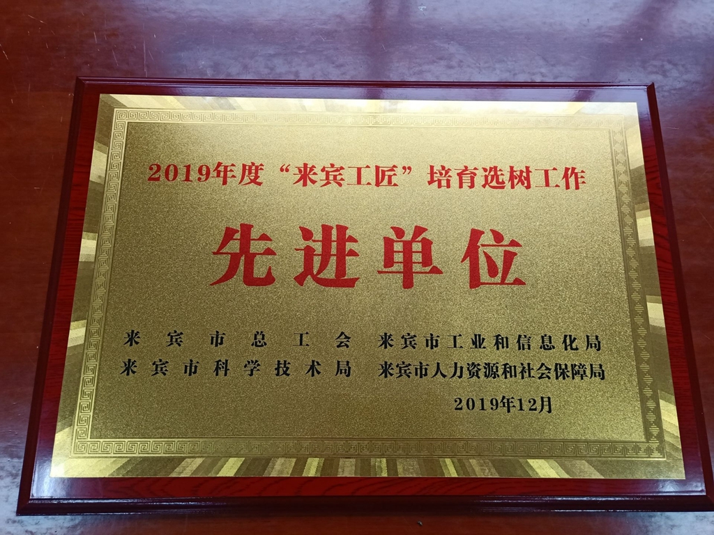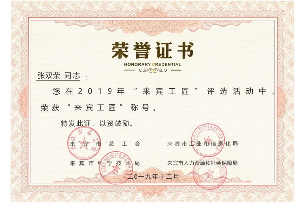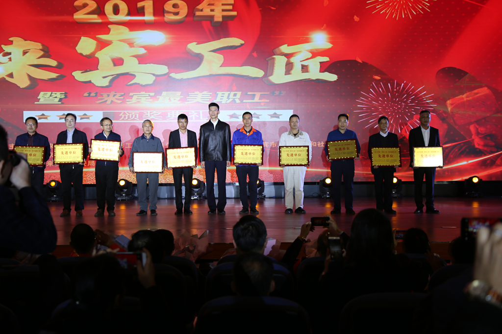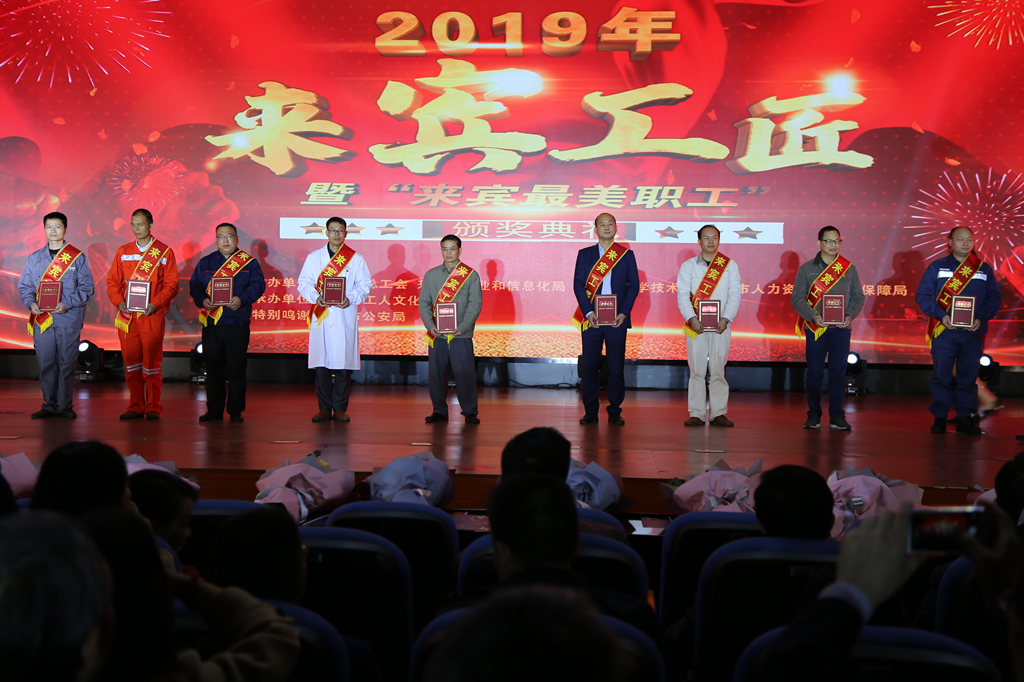 工匠精神,匠心为本。12月18日晚,由来宾市总工会等单位主办的2019年“来宾工匠”暨“最美来宾职工”颁奖典礼在市公安局礼堂举行。会上对全市10名“来宾工匠”和10名“来宾最美职工”进行了表彰,颁发了荣誉证书。公司张双荣喜获“来宾工匠”称号,公司荣获2019年度“来宾工匠”培育选树工作先进单位。