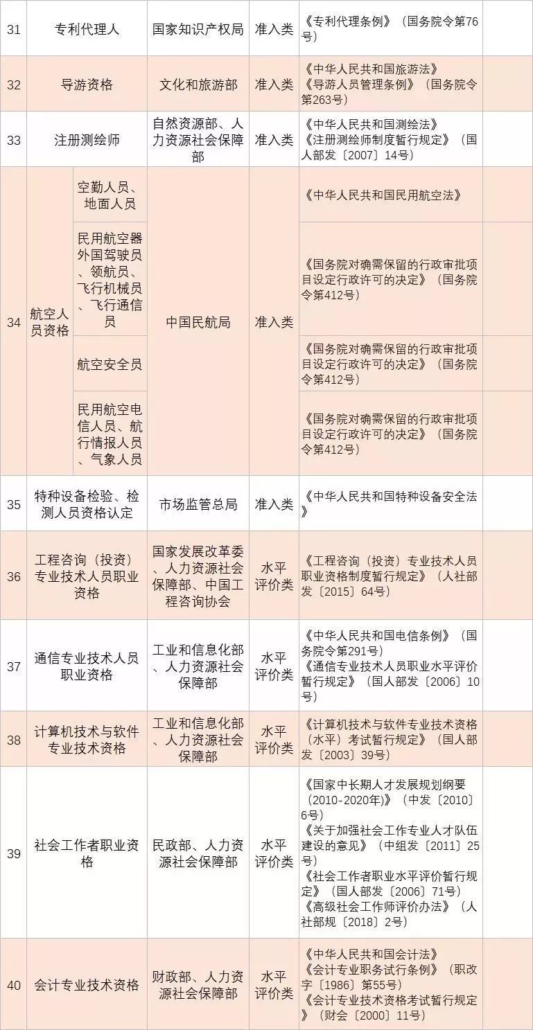 (四)深化技能人员职业资格制度改革。巩固职业资格改革成果,完善国家职业资格目录。对准入类职业资格,继续保留在国家职业资格目录内。对关系公共利益或涉及国家安全、公共安全、人身健康、生命财产安全的水平评价类职业资格,要依法依规转为准入类职业资格。对与国家安全、公共安全、人身健康、生命财产安全关系不密切的水平评价类职业资格,要逐步调整退出目录,对其中社会通用性强、专业性强、技术技能要求高的职业(工种),可根据经济社会发展需要,实行职业技能等级认定。