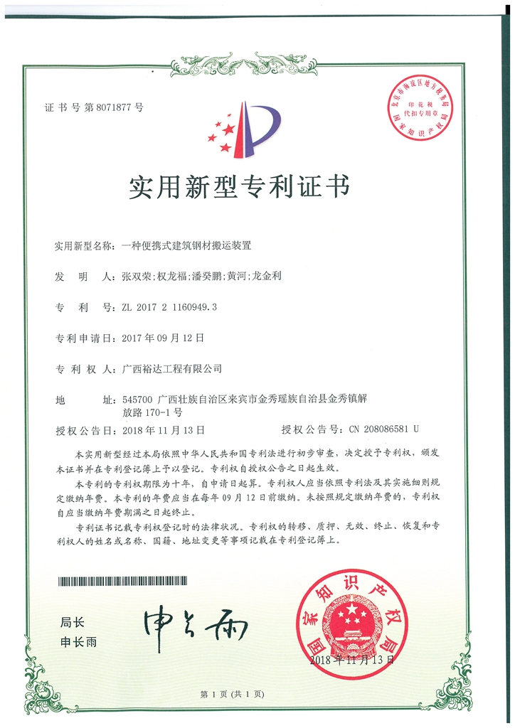 2018年实用新型专利证书(一种便携式建筑钢材搬运装置)