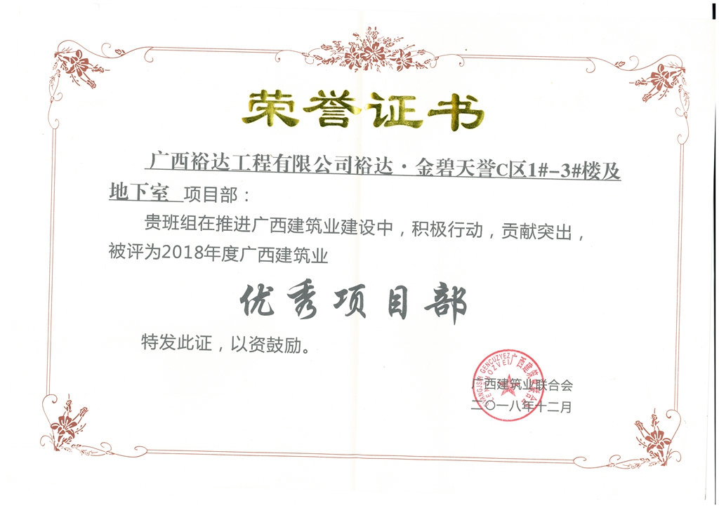 2018年优秀项目部(裕达-金碧天誉1#-3#楼及地下室项目)