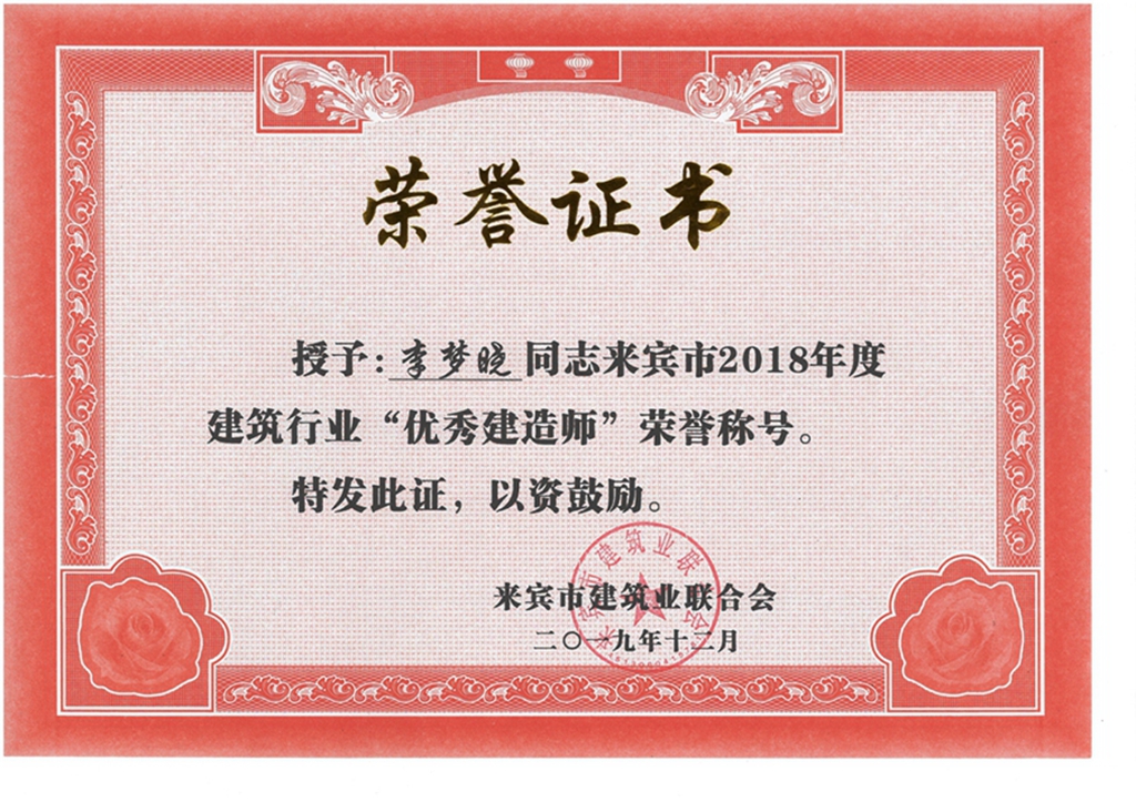 李梦晓来宾市2018年度建筑行业“优秀建造师”荣誉称号