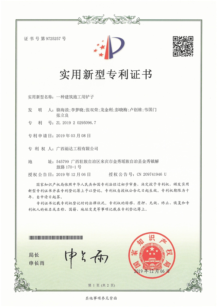 2019年实用新型专利证书(一种建筑施工用铲子)1
